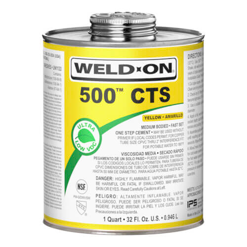 Weld-On® 500™ CTS is a yellow, Ultraniedriger VOC-Gehalt emission, Mittlere viskosität, Schnelle Abbindungting, CPVC PVC / CPVC / ABS Klebstoff for CPVC copper tube size SDR 11 Rohr and Fitting (Verbindung)s with interference fit through 2 inches (63 mm) diameter.