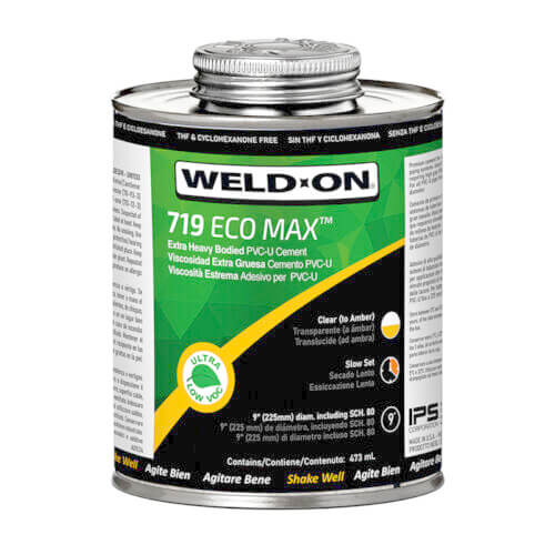Weld-On® 719 ECO™ MAX est un ciment à base de solvants (colle à solvants) PVC thixotrope de qualité supérieure et haute résistance pour les systèmes de tuyauterie PVC-U, toutes applications sous pression et sans pression, y compris PN16, jusqu'à 9 pouces / D225 mm. Il est de prise moyenne, adapté aux applications de tuyauterie industrielle et idéal pour les applications nécessitant des propriétés de remplissage d'interstices élevées.